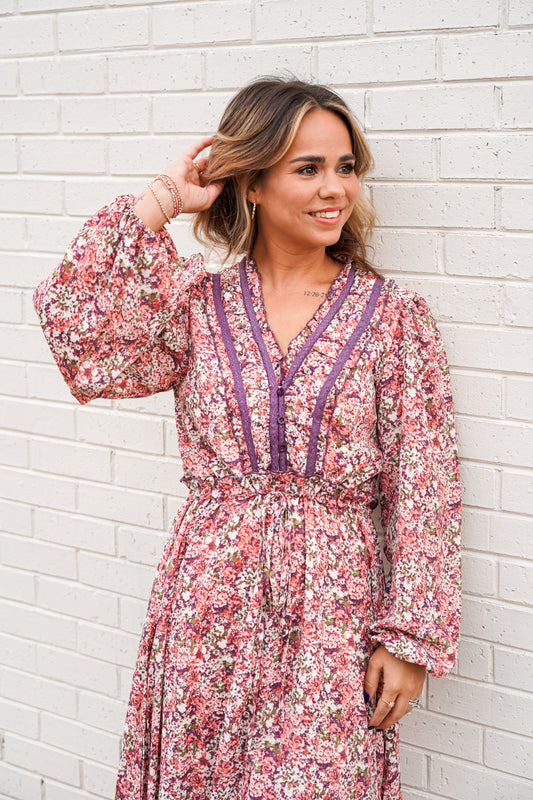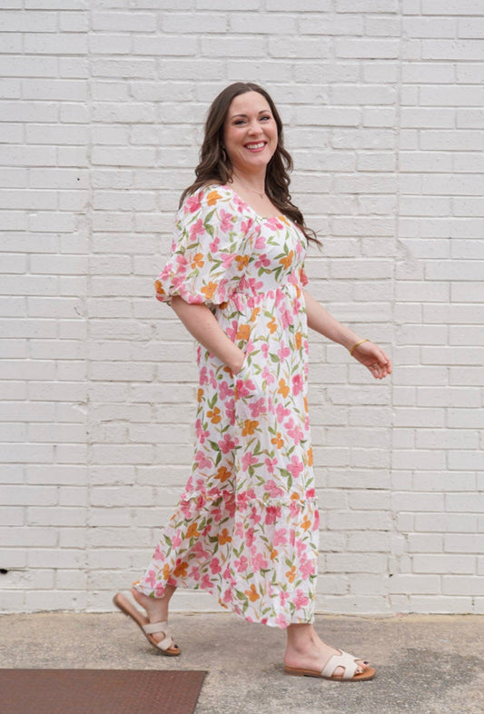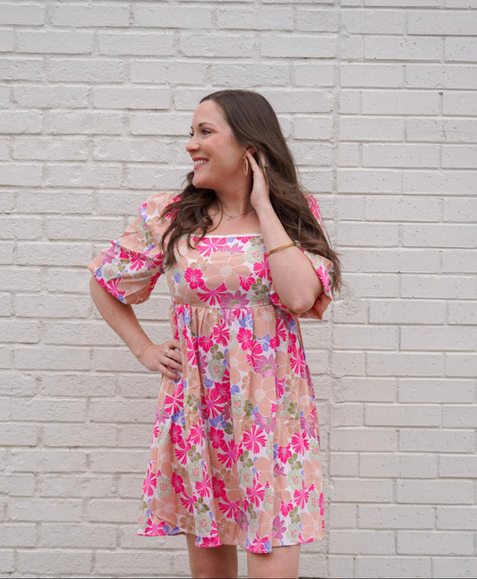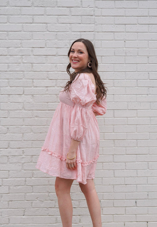 Flower-Textured Tiered Pillowy Sleeve Dress