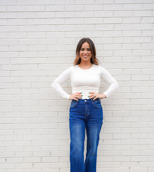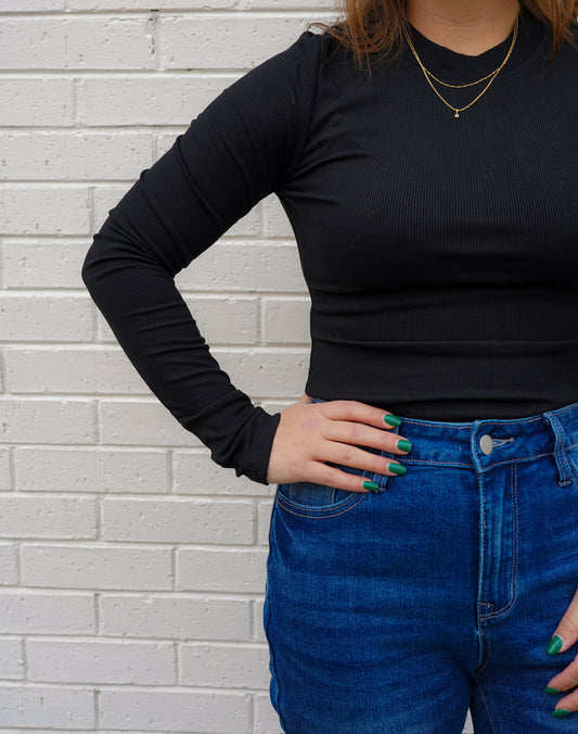 Classic Black Solid Color Ribbed Slim-Fit Long Sleeve Top