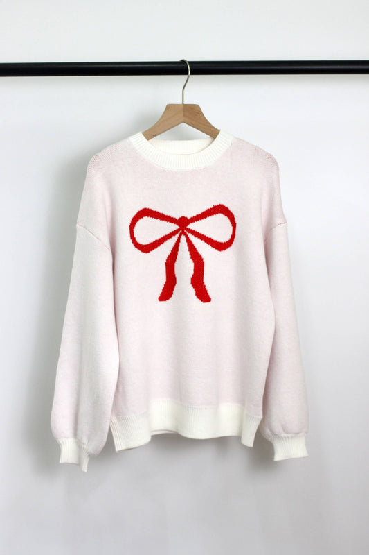 White Bow Pattern Acrylic Sweater – Soft & Chic